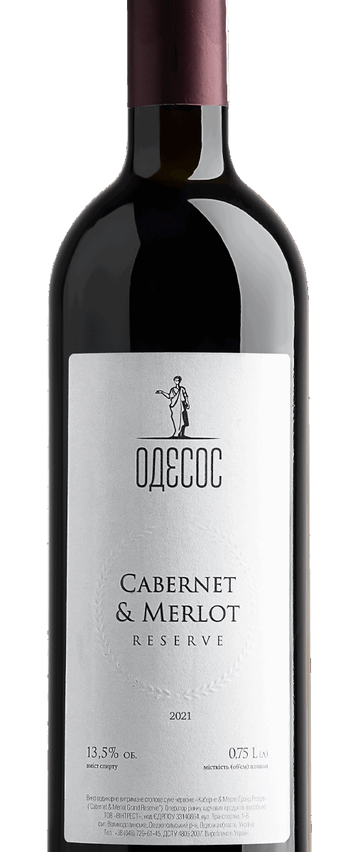 Вино Odessos Каберне-Мерло резерв 14% червоне сухе 0,75 л – повнотіле й шляхетне вино з насиченим ароматом чорних ягід, дуба і прянощів. Смак глибокий, м’який, з бархатистою текстурою. Прекрасно розкривається при повільному смакуванні. Підійде до стейку або тушкованого м’яса. Це вино — про силу, благородство й справжній смак життя.