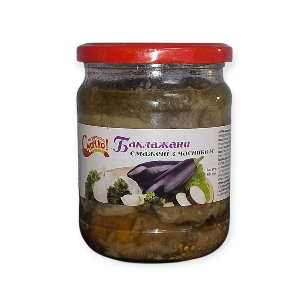 Баклажани жарені з часником (460 мл) – соковиті шматочки баклажанів, обсмажених до золотистої скоринки й залитих ароматним соусом із томатів і часнику. Страва з виразним ароматом і глибоким смаком — класика українського столу.